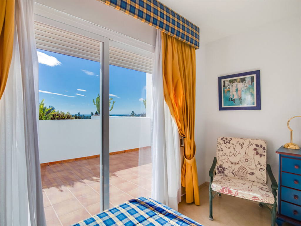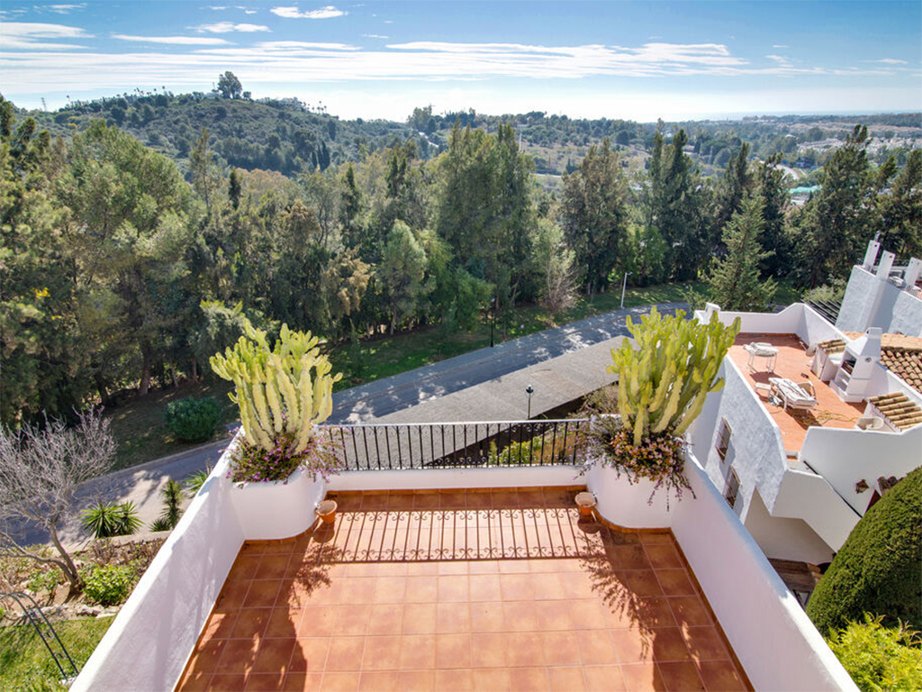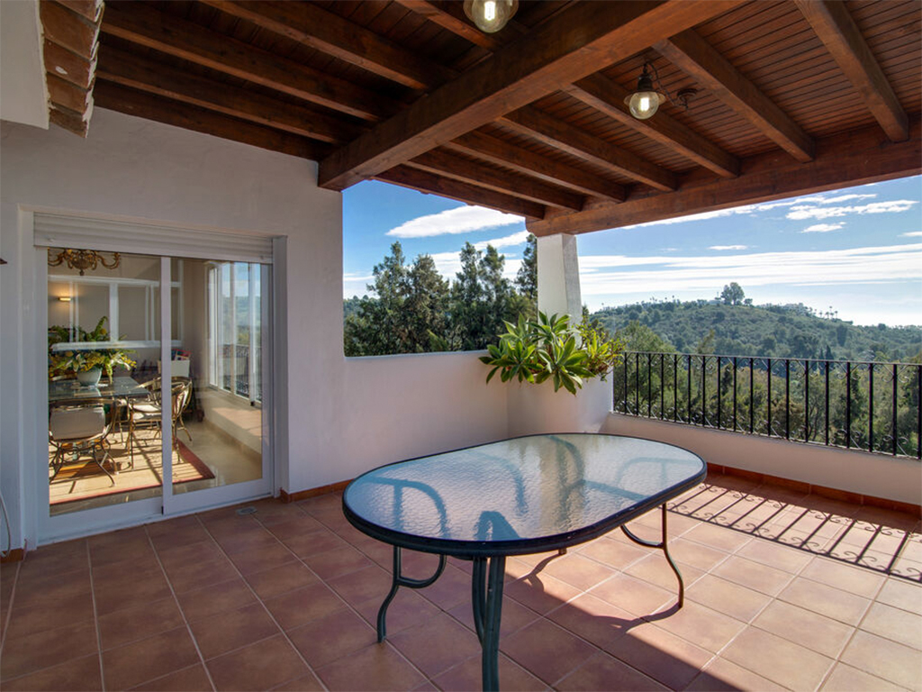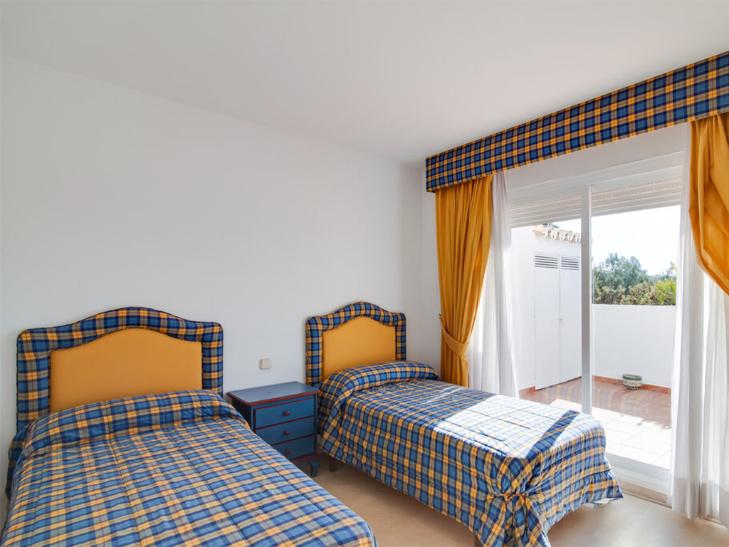 The luxury Apartamento de Lujo en Marbella, Nueva Andalucía is a contemporary holiday home in a popular golfing area yet close to beaches, shops and activities. This four bedroom, three bathroom home sleeps eight and has a shared swimming pool nearby. There's a spacious open-plan living room with beamed ceiling, family-size dining table and superb views. Three sofas are perfect for putting your feet up around the TV and fireplace and doors open onto a large covered terrace. The modern well-equipped kitchen has a breakfast table for starting the day together. Four generous bedrooms include two double ensuites on the ground floor and a double and a twin upstairs.