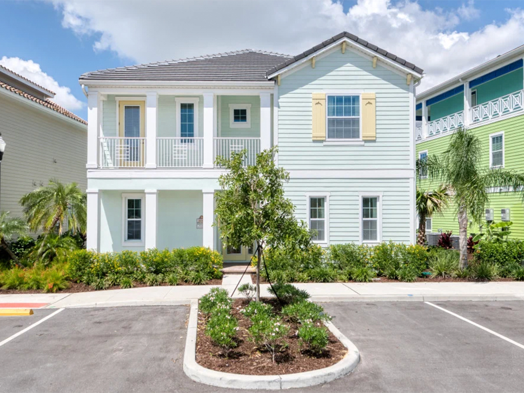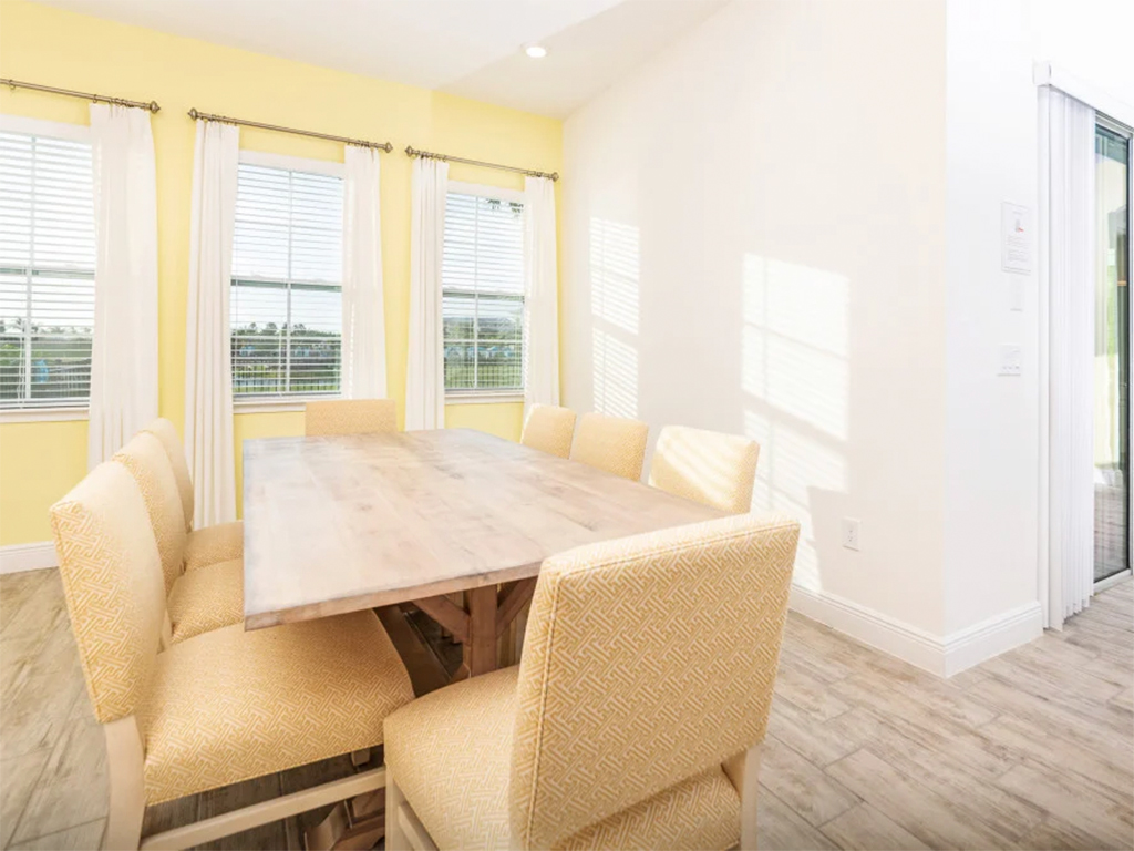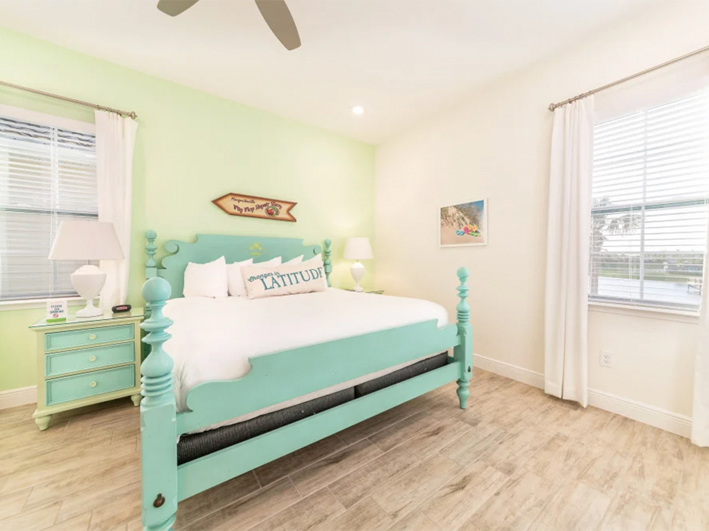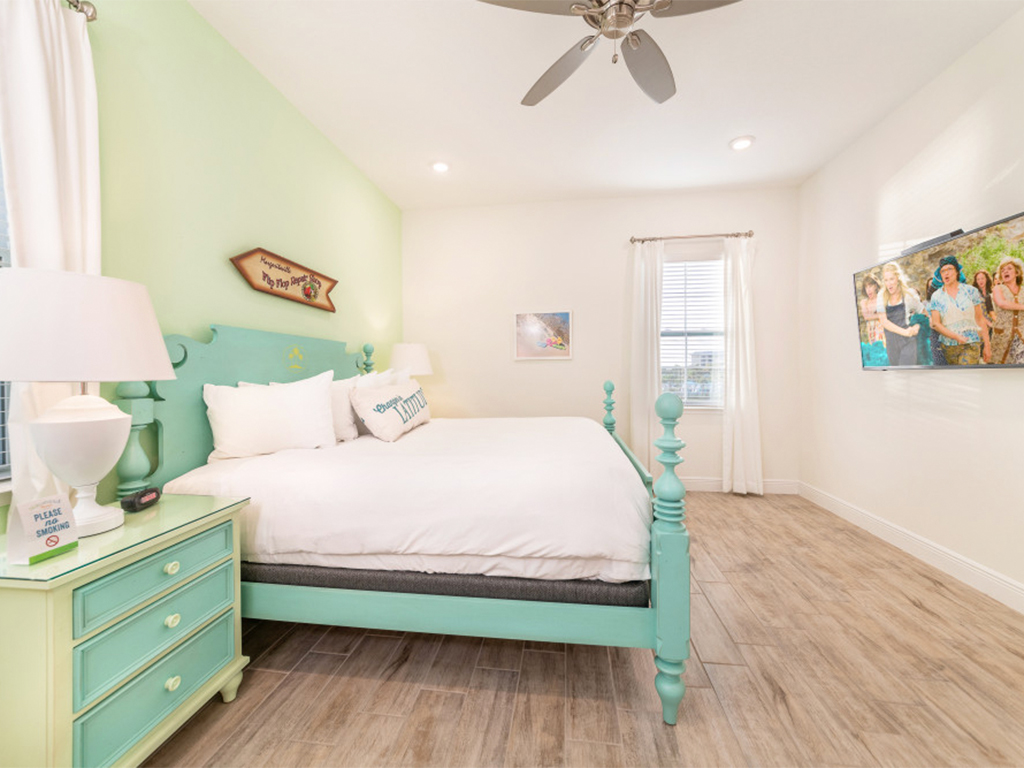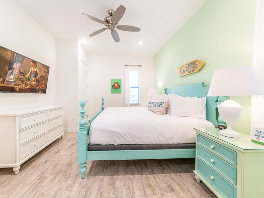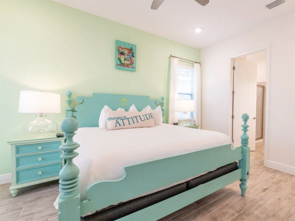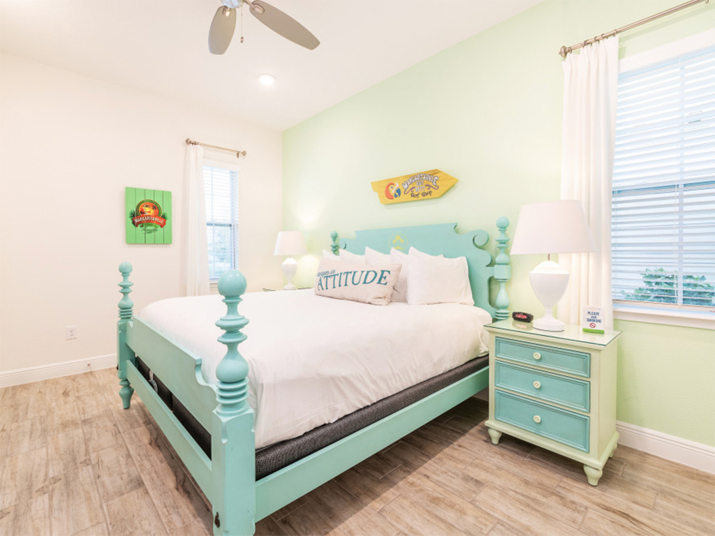 If you're looking for an outstanding six bedroom, six bathroom villa, Margaritaville 99 Kissimmee should be top of your list. Sleeping 12 guests, it has its own private pool with lake views and is just five miles from Disney. Fresh open living space includes a bright sitting area for putting your feet up with triple sliding doors giving views of the terrace and pool. Wood tile flooring flows into the fully fitted kitchen with island and wrap-around breakfast bar adjoining the formal dining area. Upstairs there's a second sitting area with sofas and ensuite bedrooms (four king-size and three queen-size) with flatscreen TVs and pastel decor.