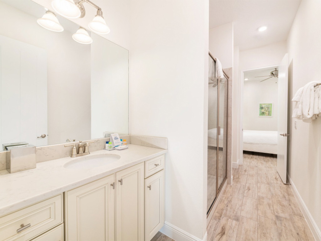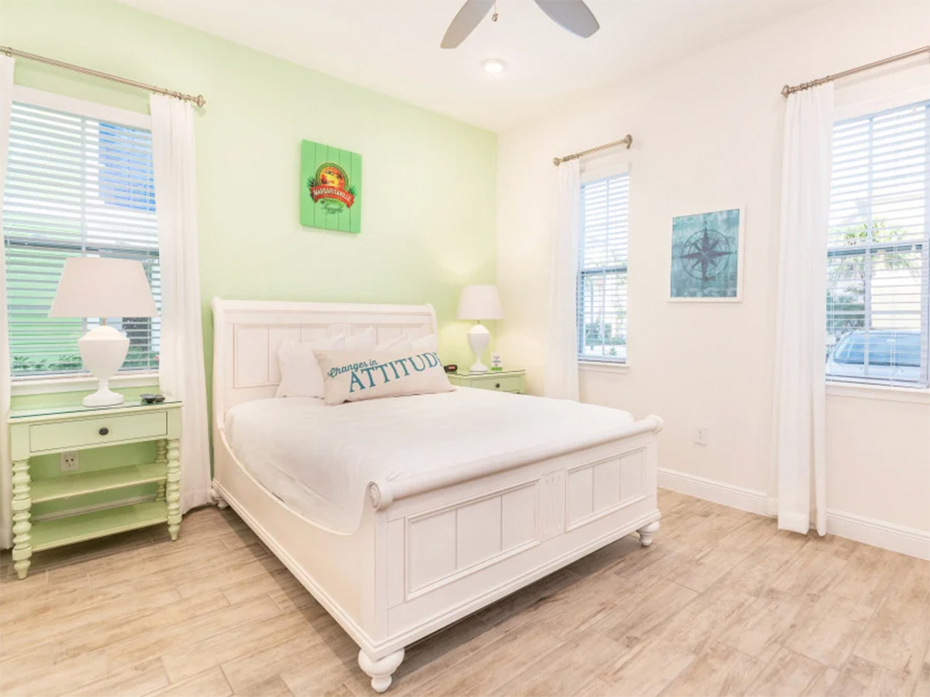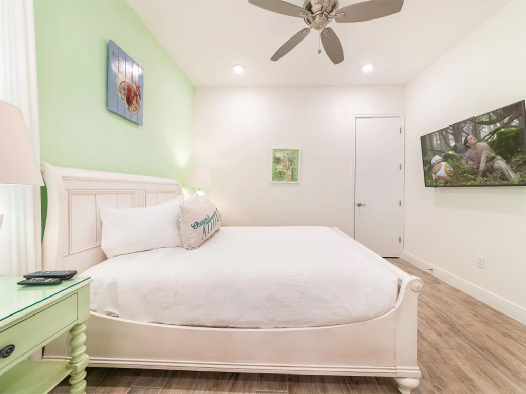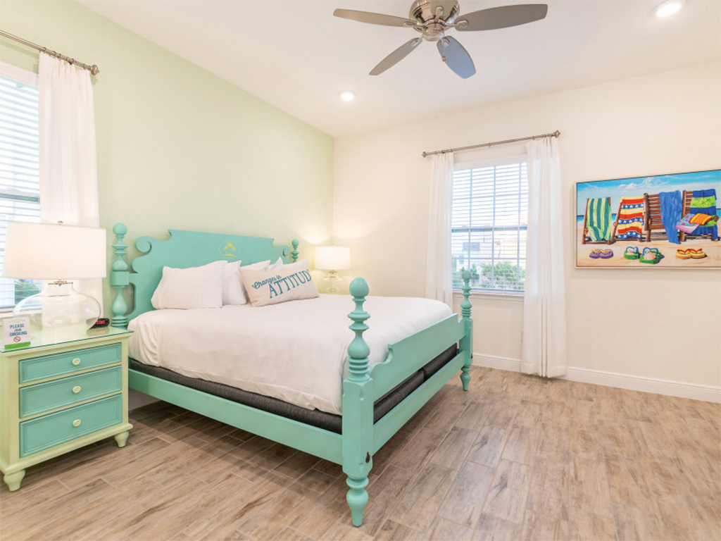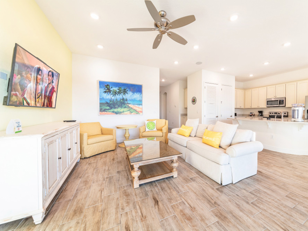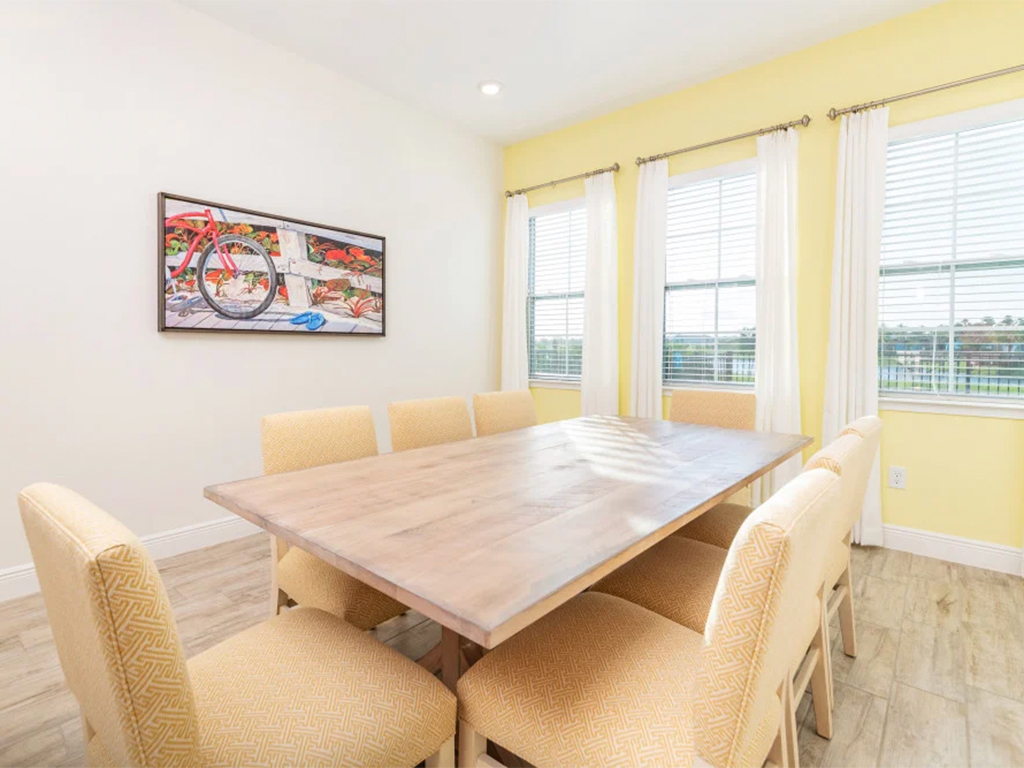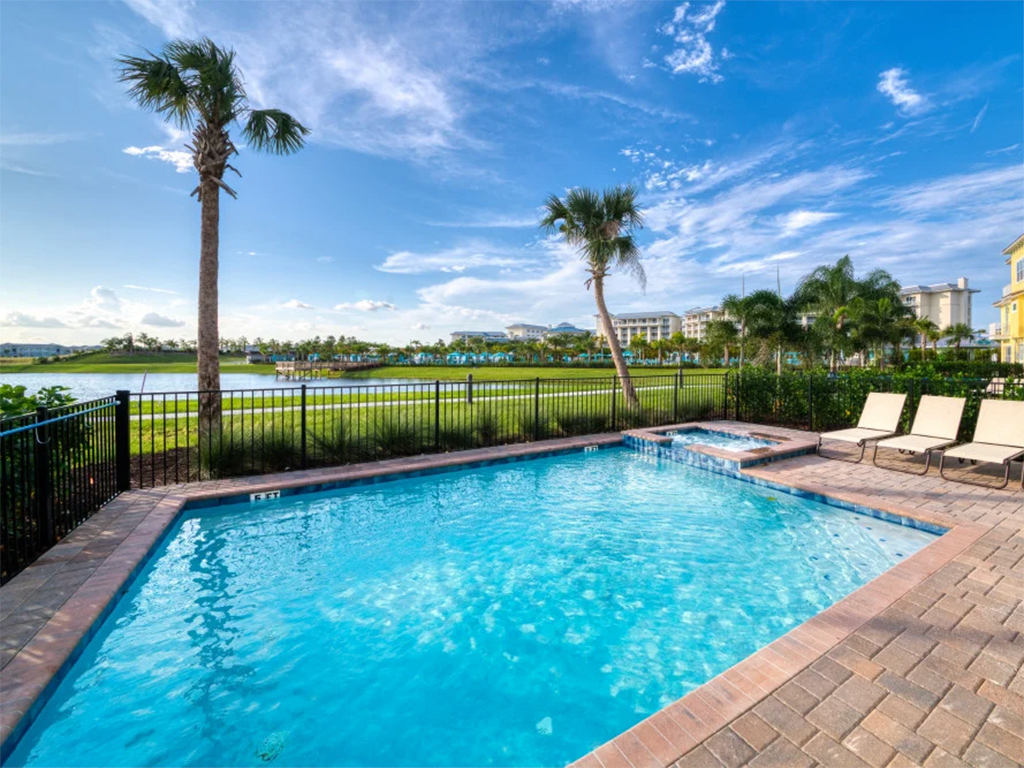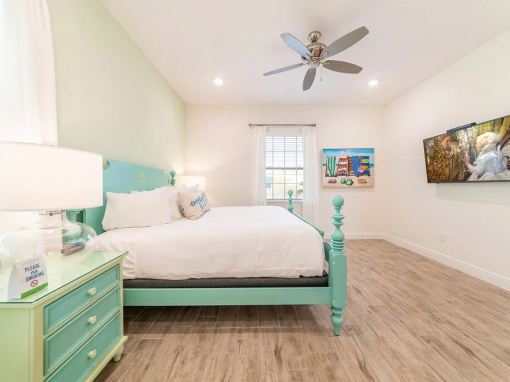 If you're looking for an outstanding six bedroom, six bathroom villa, Margaritaville 99 Kissimmee should be top of your list. Sleeping 12 guests, it has its own private pool with lake views and is just five miles from Disney. Fresh open living space includes a bright sitting area for putting your feet up with triple sliding doors giving views of the terrace and pool. Wood tile flooring flows into the fully fitted kitchen with island and wrap-around breakfast bar adjoining the formal dining area. Upstairs there's a second sitting area with sofas and ensuite bedrooms (four king-size and three queen-size) with flatscreen TVs and pastel decor.