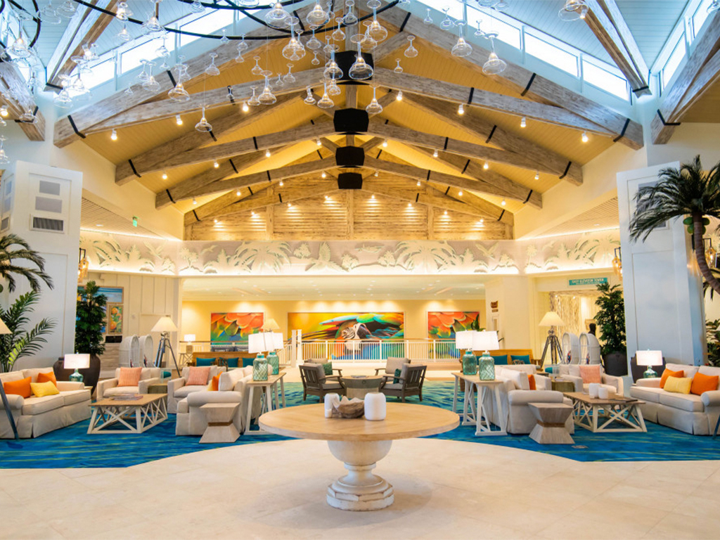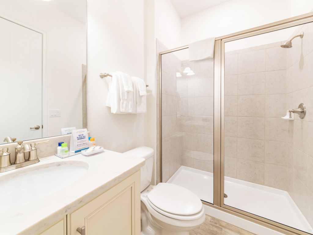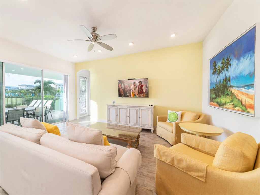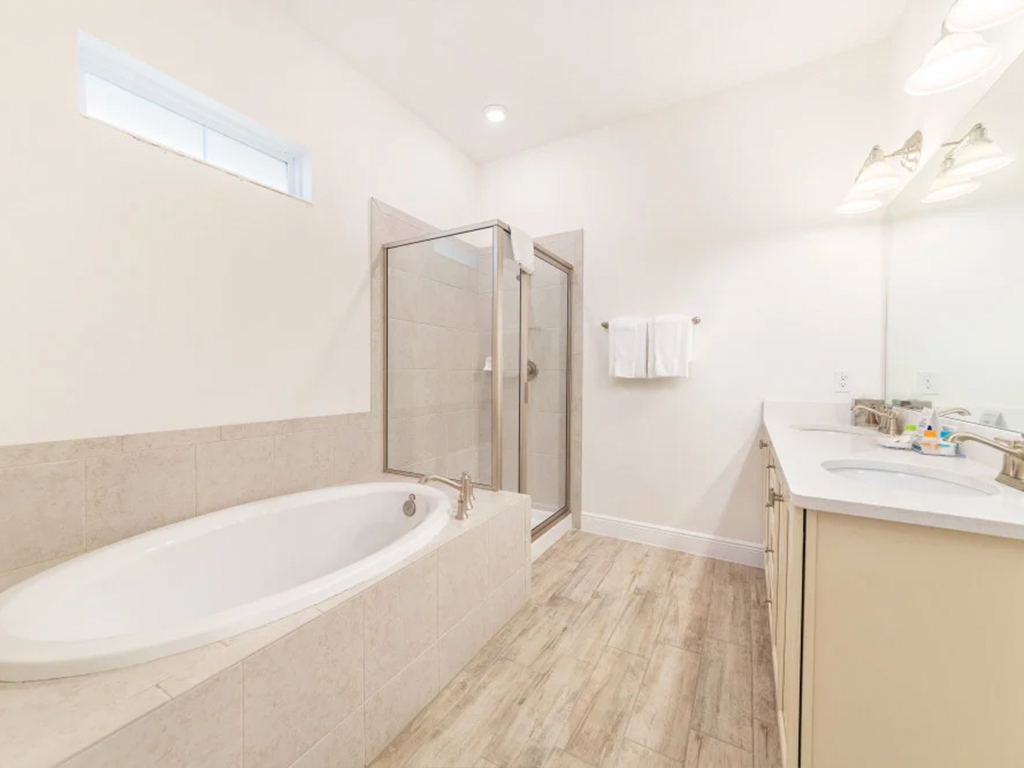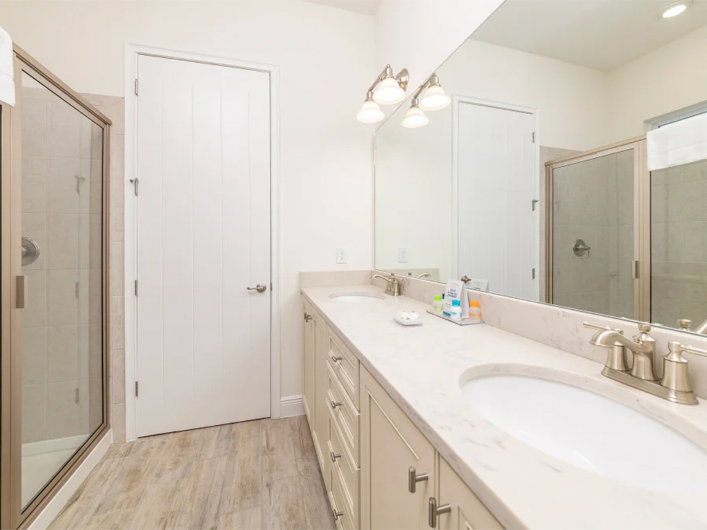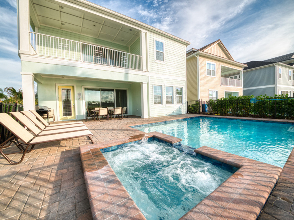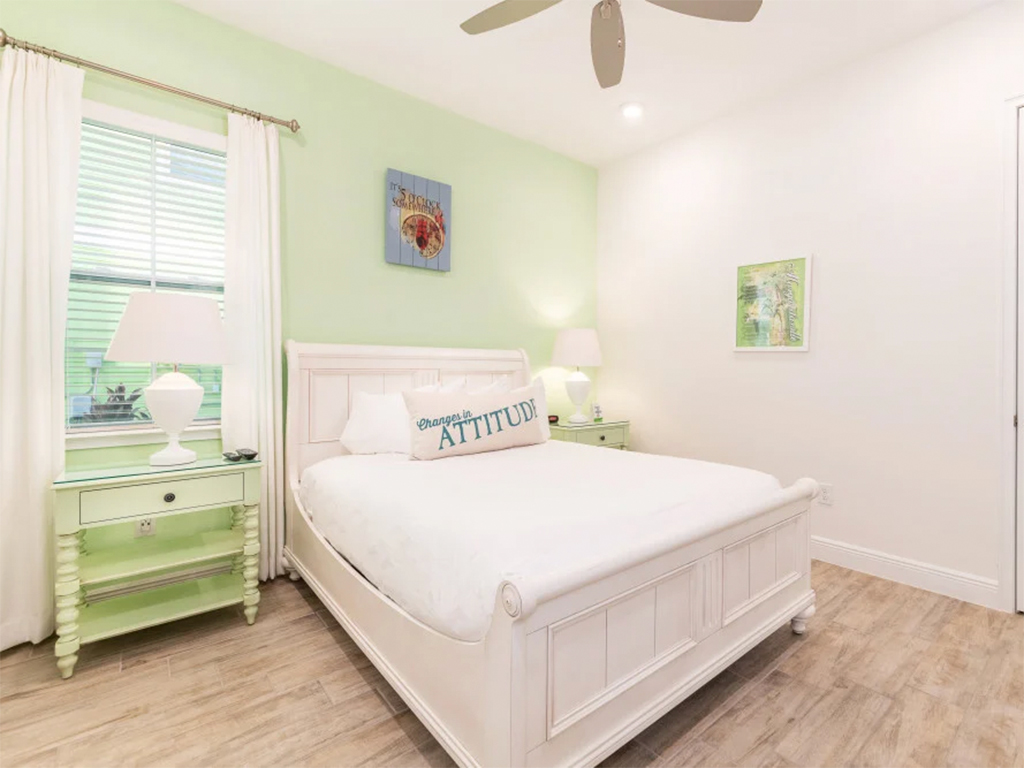 If you're looking for an outstanding six bedroom, six bathroom villa, Margaritaville 99 Kissimmee should be top of your list. Sleeping 12 guests, it has its own private pool with lake views and is just five miles from Disney. Fresh open living space includes a bright sitting area for putting your feet up with triple sliding doors giving views of the terrace and pool. Wood tile flooring flows into the fully fitted kitchen with island and wrap-around breakfast bar adjoining the formal dining area. Upstairs there's a second sitting area with sofas and ensuite bedrooms (four king-size and three queen-size) with flatscreen TVs and pastel decor.